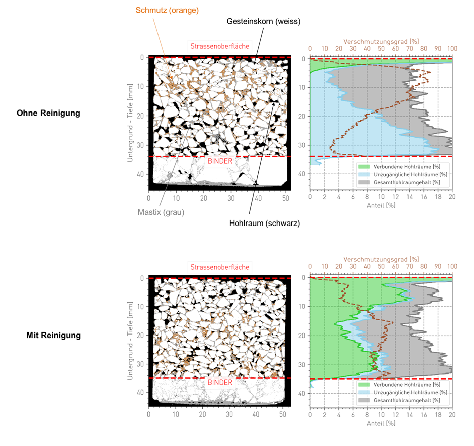 Querschnittsprofile (CT-Scans, links) und entsprechende AVCA-Auswertung (rechts) zweier Bohrkerne eines Untersuchungsstandortes. Beim ungereinigten Abschnitt sind die Hohlräume in den ersten ca. 20 mm stark verschmutzt (braune Linie), folglich sind die Porenvolumen grösstenteils verschlossen. Beim gereinigten Abschnitt ist der Verschmutzungsgrad in der obersten Schicht deutlich tiefer und die vorhandenen Hohlräume sind mehrheitlich miteinander verbunden (grüne Fläche). (Quelle: Grolimund + Partner AG)