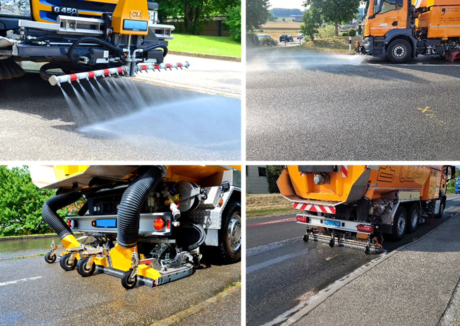 Die Reinigungen werden mit speziellen Flächenreinigungsmaschinen durchgeführt, welche über eine Hecksauganlage verfügen. Das auf die Strasse aufgebrachte Wasser kann so wieder abgesogen werden. Nur so kann der in der oberen Schicht des Belags aufgeweichte Schmutz effektiv entfernt werden. Grundsätzlich stehen zwei verschiedene Reinigungsverfahren zur Verfügung: Frontwaschbalken mit Hecksauganlage und Rotocleaner/Rotoplast.