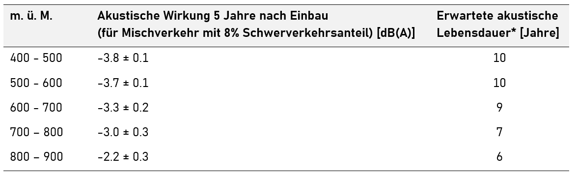 Akustische Belagswirkung 5 Jahre nach Einbau und die erwartete Lebensdauer aufgrund aller in der Schweiz von Grolimund + Partner AG gemessenen SDA 4 Beläge, Angaben pro Höhenkategorie m. ü. M.]