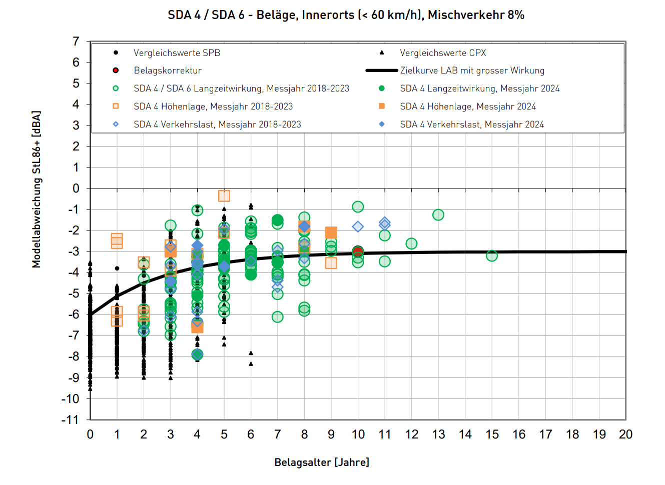 Die akustische Wirkung sowie das akustische Alterungsverhalten von Strassenbelägen ist ausserdem abhängig von vielen weiteren Faktoren wie beispielsweise Mischgutzusammensetzung, Verdichtung und Oberflächentextur.