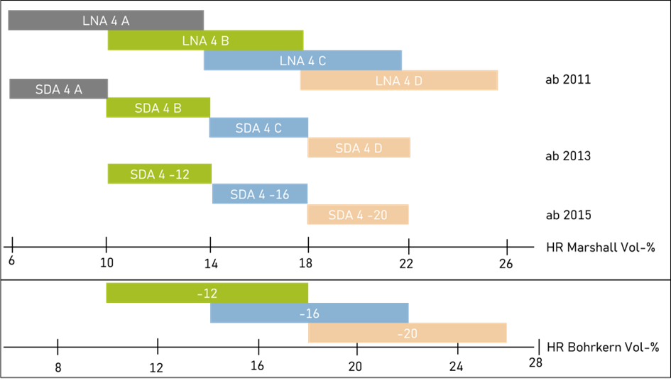 In den SN Normen wurden die Bezeichnungen der semidichten Mischgutsorten während den letzten Jahren angepasst. Auf den Begriff LNA (Low Noise Asphalt) folgte SDA (semidichte Asphalte) mit den Typen A, B, C, und D. Später wurden die SDA neu mit einem Hohlraumbereich klassiert (z.B. SDA 4-12).2 Ref Schlussbericht TP 3.